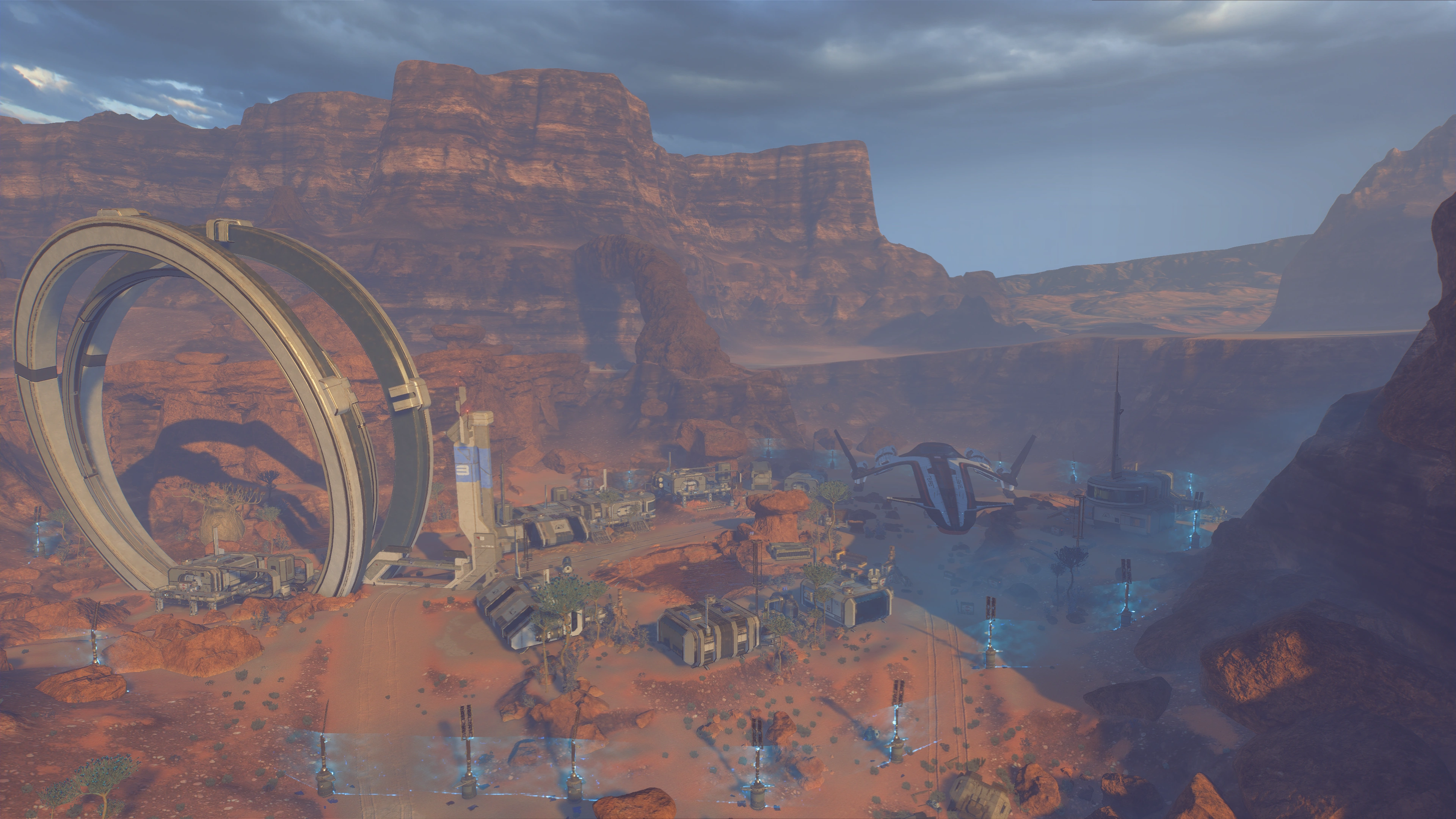 The site consists of a U-shaped cluster of small structures surrounding a small water pool and a power relay station to the southeast on a ridge. The buildings have alphanumeric designations on their exterior walls for identification. A forward station drops down from orbit in the middle of the site when called in by Ryder, in order to gain access codes to a storage crate containing the ND1 Nomad.
