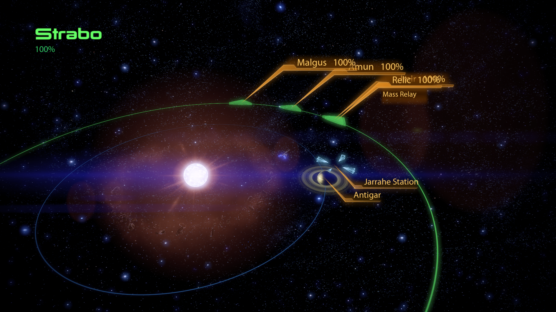 Strabo is composed of a gas giant, a secretive research space station orbiting the gas giant, and an asteroid belt. Its sole gas giant has been charted by the salarians. It has moderate resources.