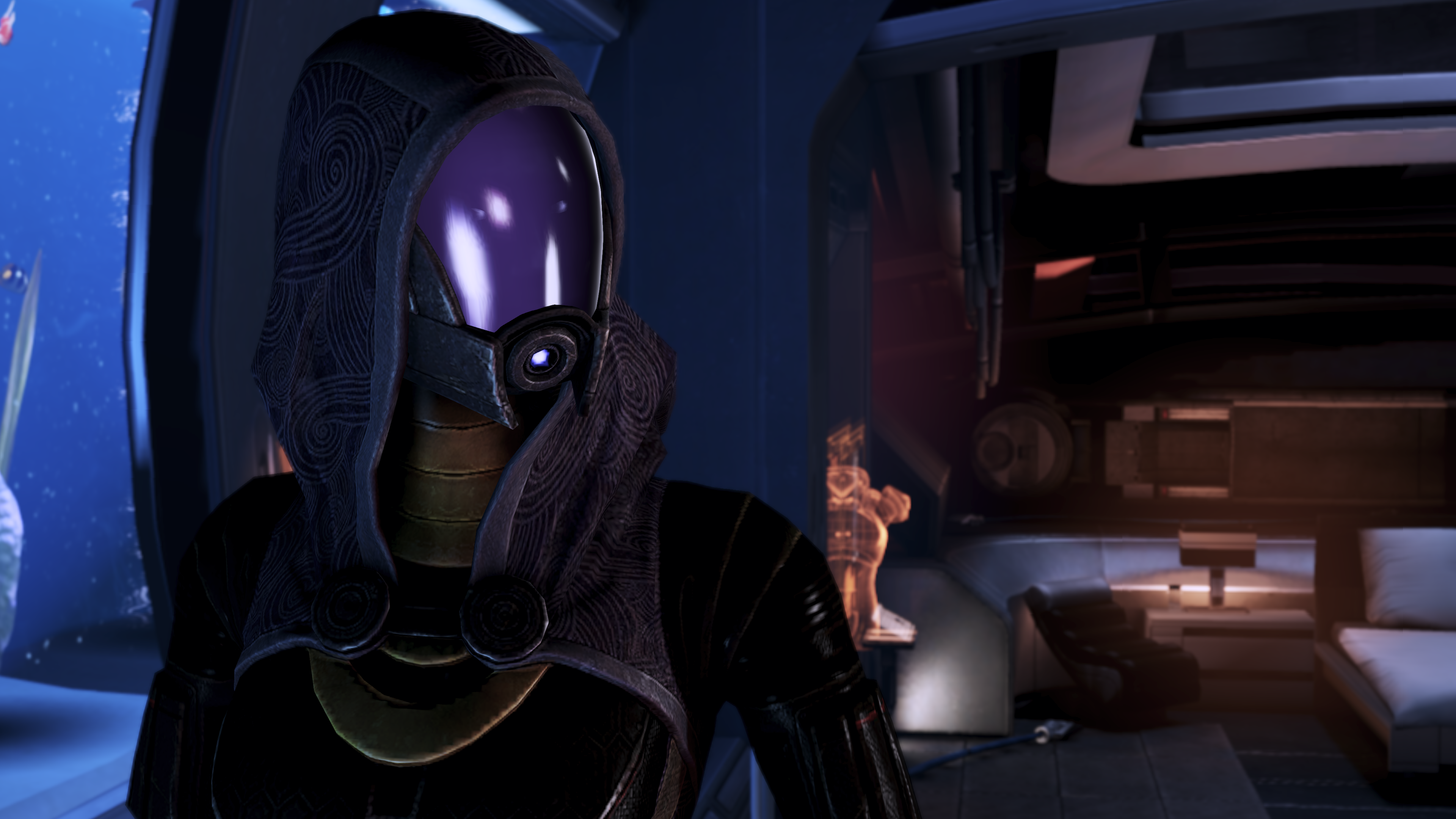 If Garrus asks if they're interrupting any "plans" afoot in the "Tali-Shepard love nest", she just taunts him or responds he'll never know. If Garrus alludes to a "Traynor-Shepard love nest" instead, Tali slyly remarks that "checkmate" takes on a different meaning when Samantha replies they'll just be having "chess".