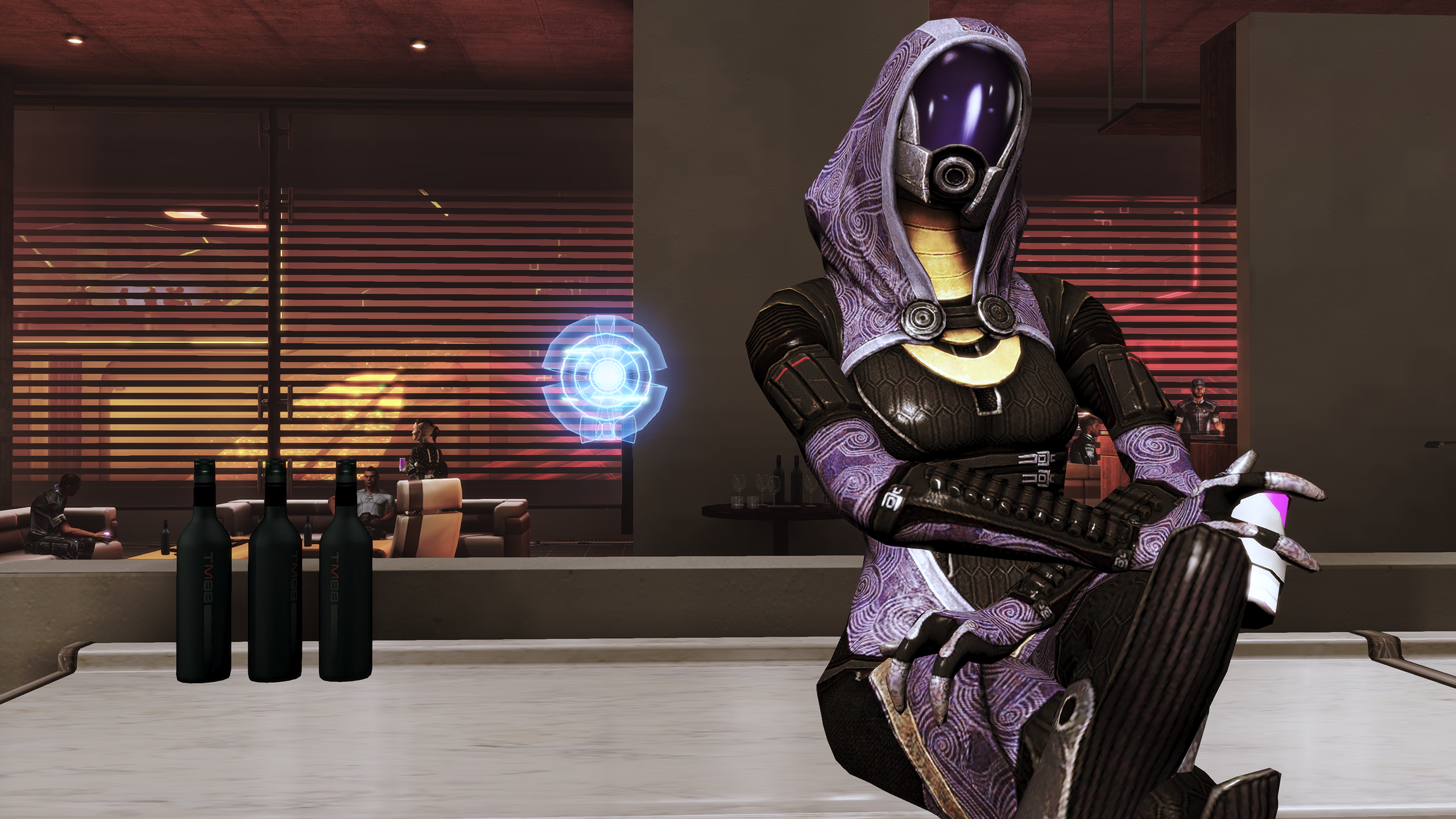 When Traynor gets the guests to recount their history with Shepard, Tali recalls first meeting Shepard, and all she kept thinking then was that she hoped Shepard took a shower because her filter needs replacing and humans carry a lot of germs. Liara remarks that three years later, she's either eating Shepard's food or drinking Shepard's booze in a straw, calling it "progress." If Tali and Shepard are lovers, Liara instead deadpans that the quarian's not thinking about the germs anymore, and Traynor chimes in that Tali may still picture him in the shower.