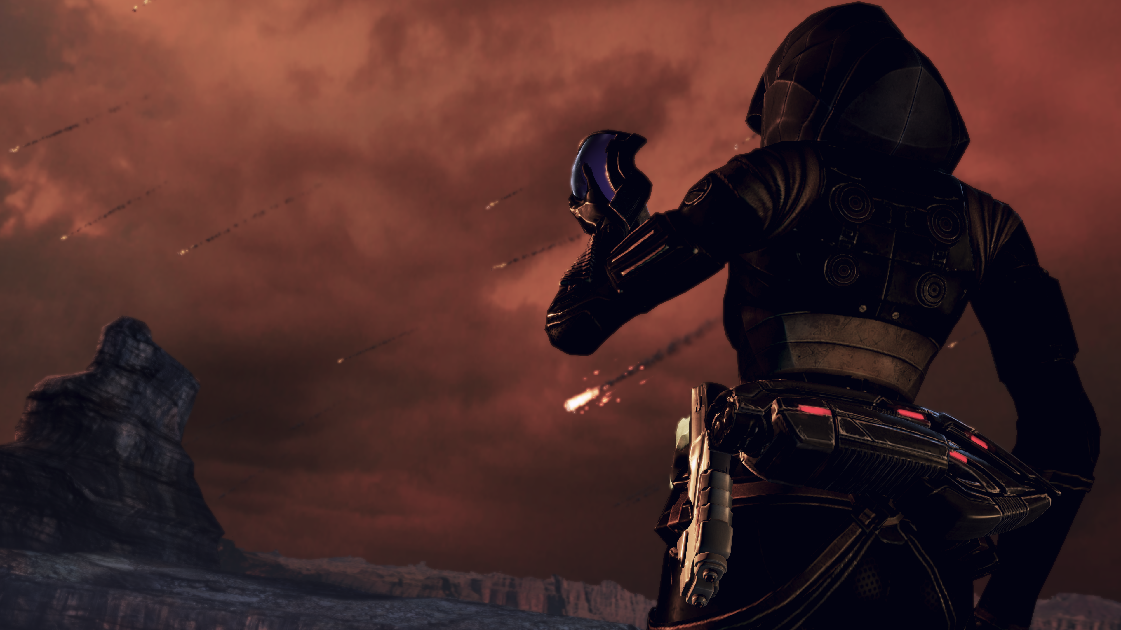 If Shepard allows the geth to be upgraded, Tali watches in horror as she witnesses the entirety of the Migrant Fleet crash and burn up in Rannoch's atmosphere. Filled with despair, she removes her mask, declares "I'm sorry", and commits suicide by throwing herself off a cliff. Shepard tries desperately to catch her but to no avail.