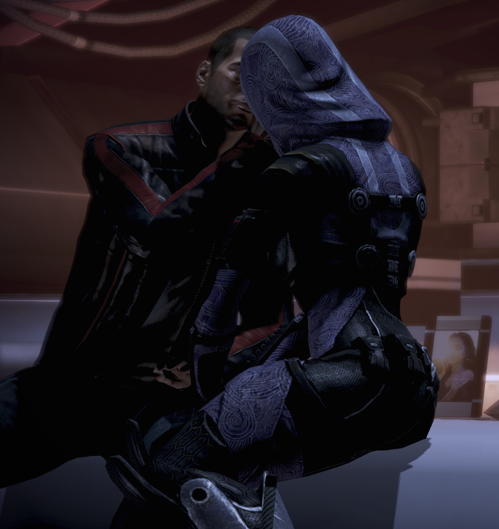 Shortly before the Normandy's entry into the Omega 4 Relay, Tali nervously goes to Shepard's room saying that she has taken several antibiotics and herbal supplements to bolster her immune system. Speaking nonstop (a "defense mechanism"), she becomes visibly nervous about removing her bio-suit and having her first intimate experience. Shepard eases her worries and proceeds to remove her mask, viewing her face unobstructed for the first time. Her fears gone, Tali pounces on Shepard and passionately kisses him as the scene fades to black.