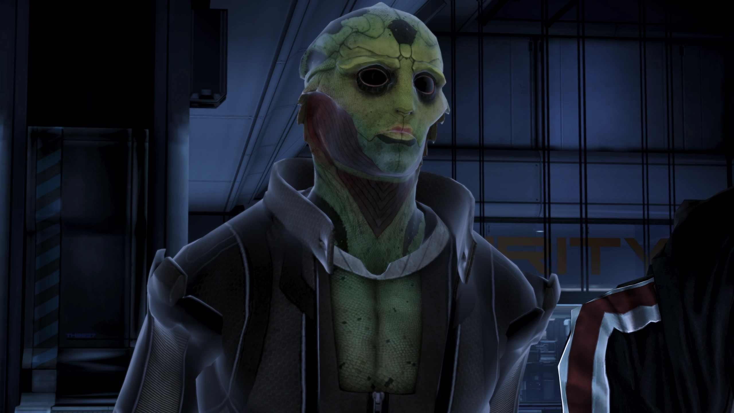 Thane was present at the Citadel to render judgment upon the Cerberus agent named Rasa. He stalked his prey from afar and an opportunity presented itself when she walked into a bar. Thane had a spiked drink sent her way, and an unsuspecting Rasa quaffed it. He later claimed responsibility for the agent when she groggily stumbled out of the bar and ran afoul a turian cop who was holding her up for drunkenness.