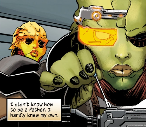 With no civilian experience, Thane took menial jobs. He was especially miffed at a krogan construction foreman who singled him out for some reason, musing he could've killed the krogan with a finger. With the birth of Kolyat, Thane thought he didn't know how to be a father, and was distant throughout his son's formative years. The struggle of normal life caught up with him, and he decided to freelance his assassin skills. Irikah supported him, as he knew she would.