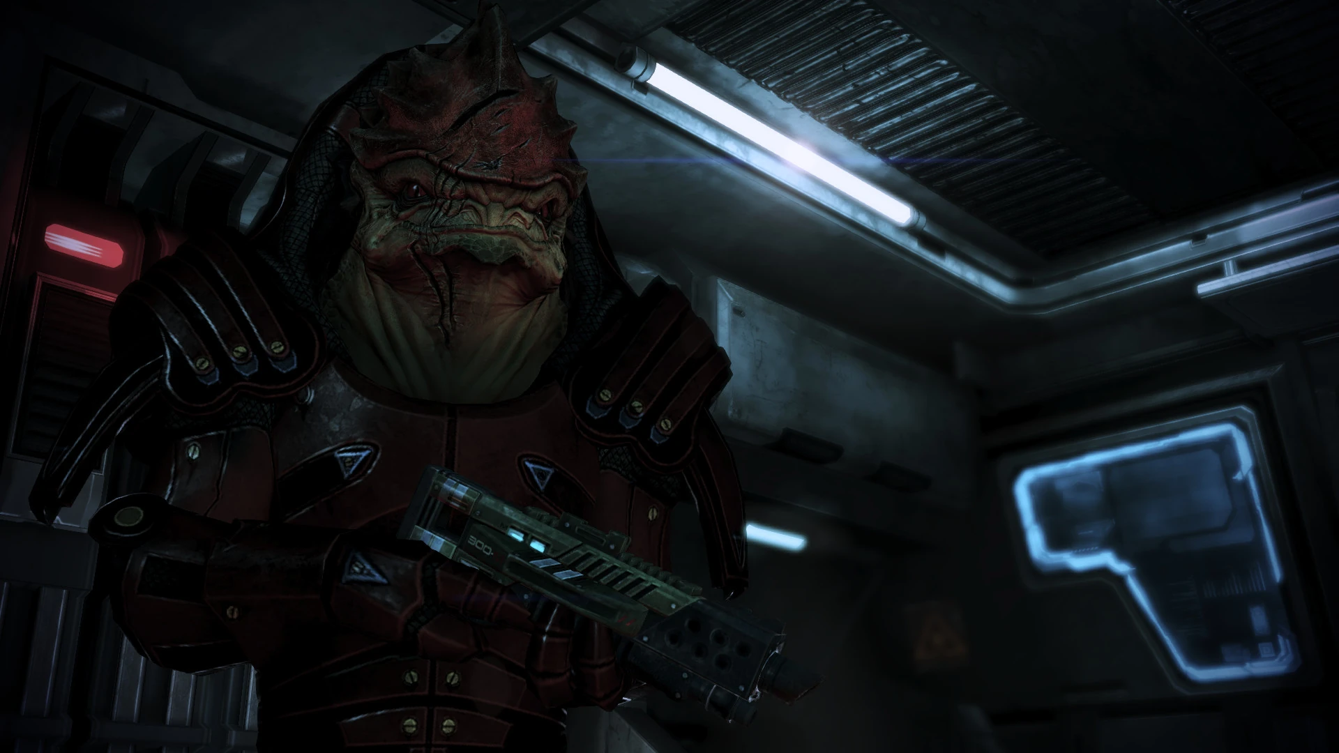 If Wrex is one of the squadmates for retaking the Normandy, unlike everyone else who'd use their omni-tool to hack the ship's outer hatch, Wrex simply draws his shotgun and shoots a nearby panel to unlock the hatch.