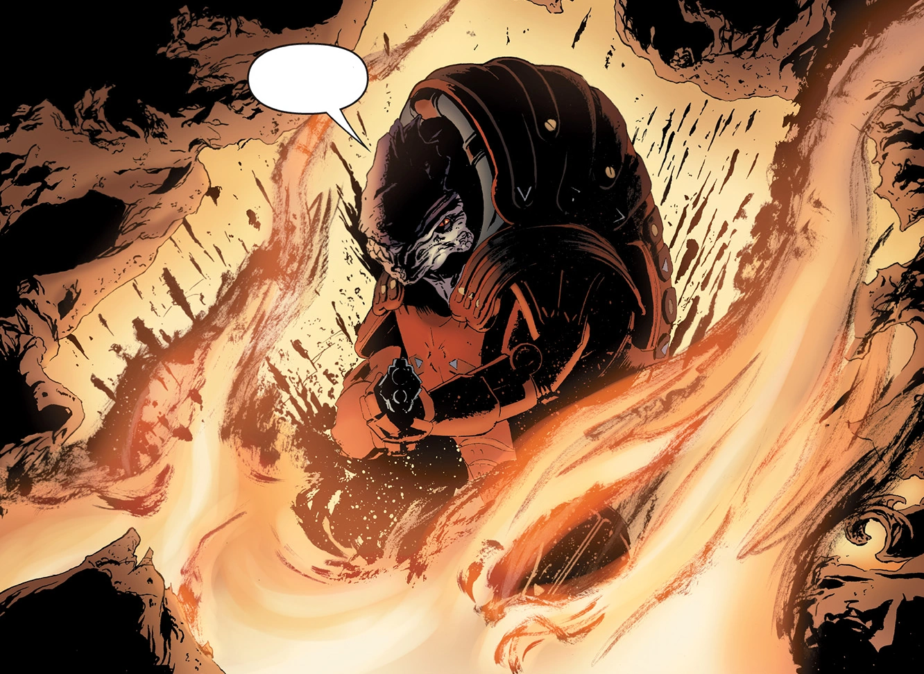 Wrex orders the clans to assemble at the Hollows, riding with Shepard down to the planet. His brood brother Wreav radios in to say that Reapers have begun attacking the Hollows. Wrex orders Shepard to keep the Reapers away from Eve while he sorts out what's happening with the other clans, reemerging later bloodied but positively beaming.